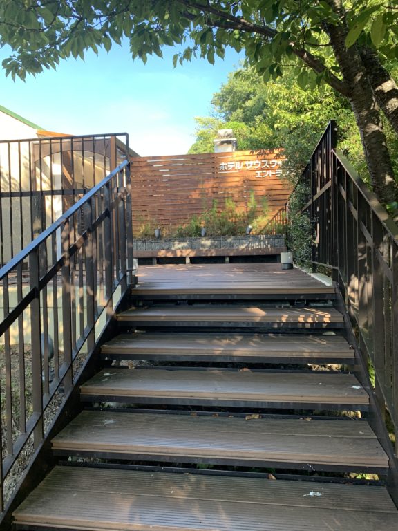 2023 July Japan Trip The entrance to the Hotel Rooms. It was so nice to feel the woods. 私達が滞在していた、ホテル入り口。都会を離れて、緑の中で。
