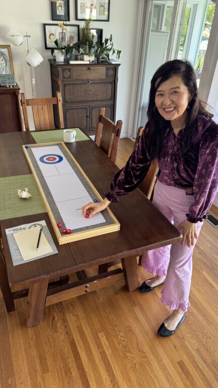 2026 Feb. We are so inspired by the Winter Olympics! We are playing table curling at home. It is so fun! I studied from the world class pros.